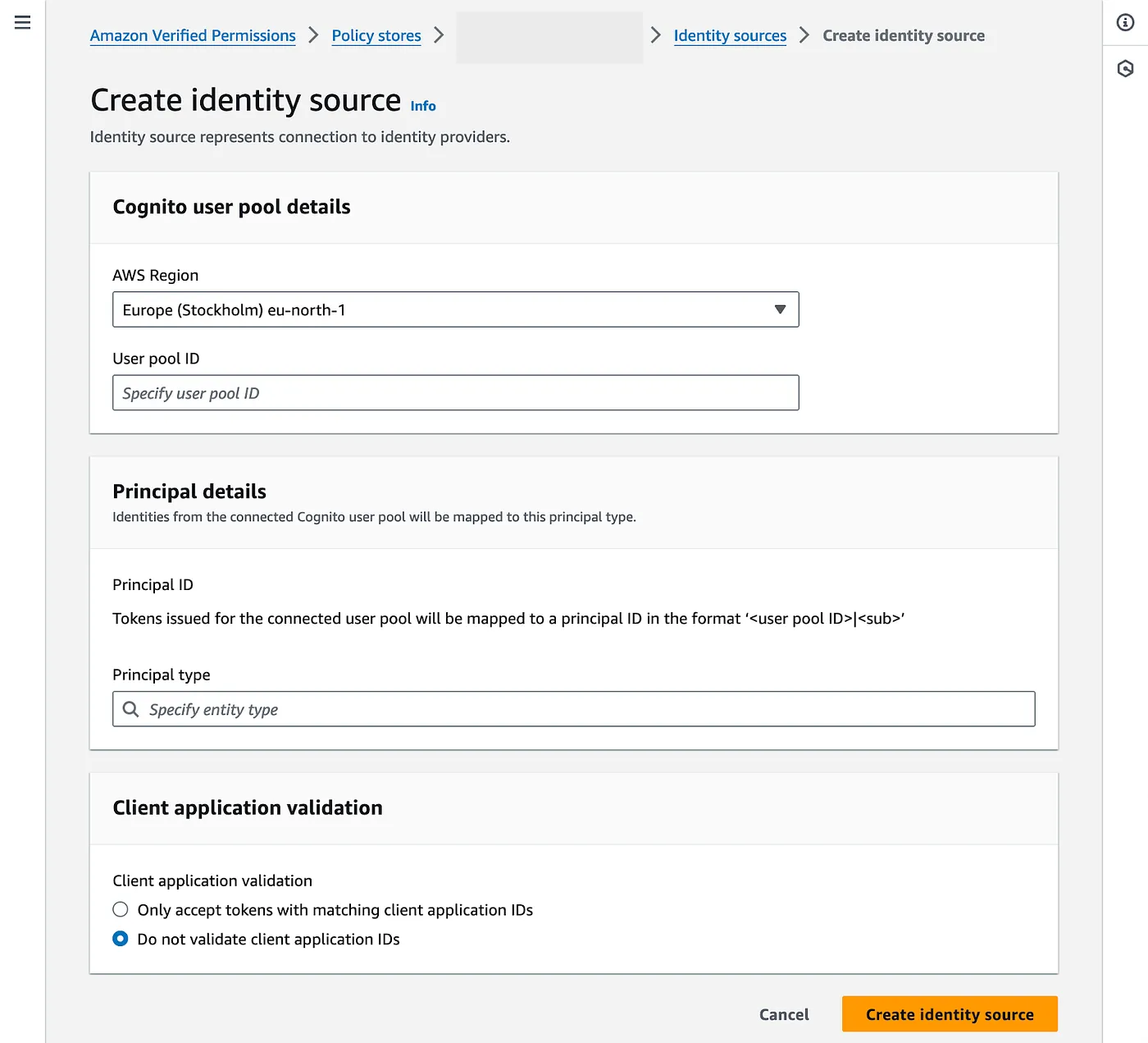 No matter the approach, you must define the Cognito User Pool ID and map the principal. It is not that the identifier will be a combination of the user pool ID and the user sub. Additionally, you can restrict the validation to specific client application identifiers only.