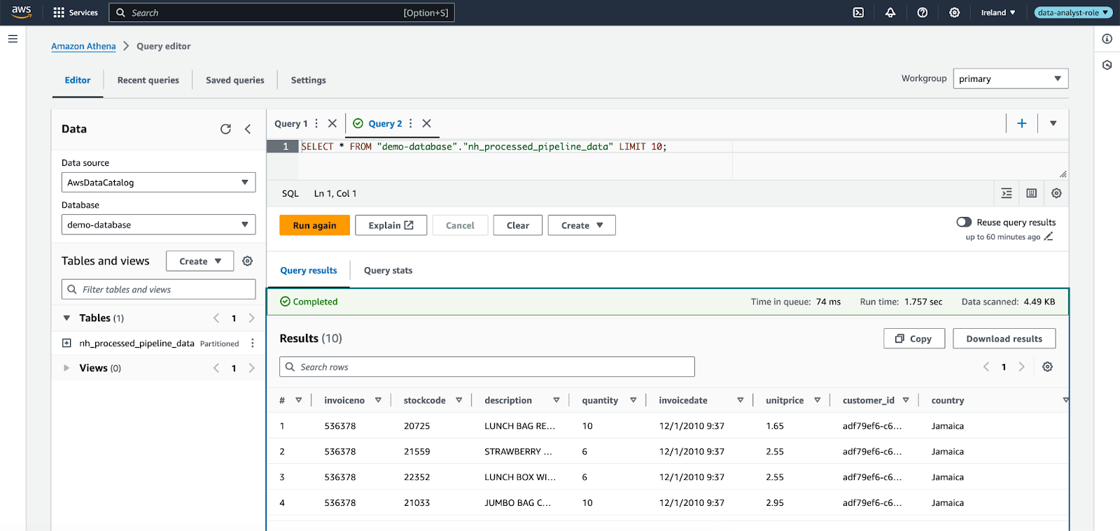 Notice how on the data analyst role I’m able to see only one data catalog table available for querying with Athena, even though several tables were created in the infrastructure. This is because the tables have been registered with Lake Formation and we gave the data analyst role only access to the one table shown in the screenshot above.