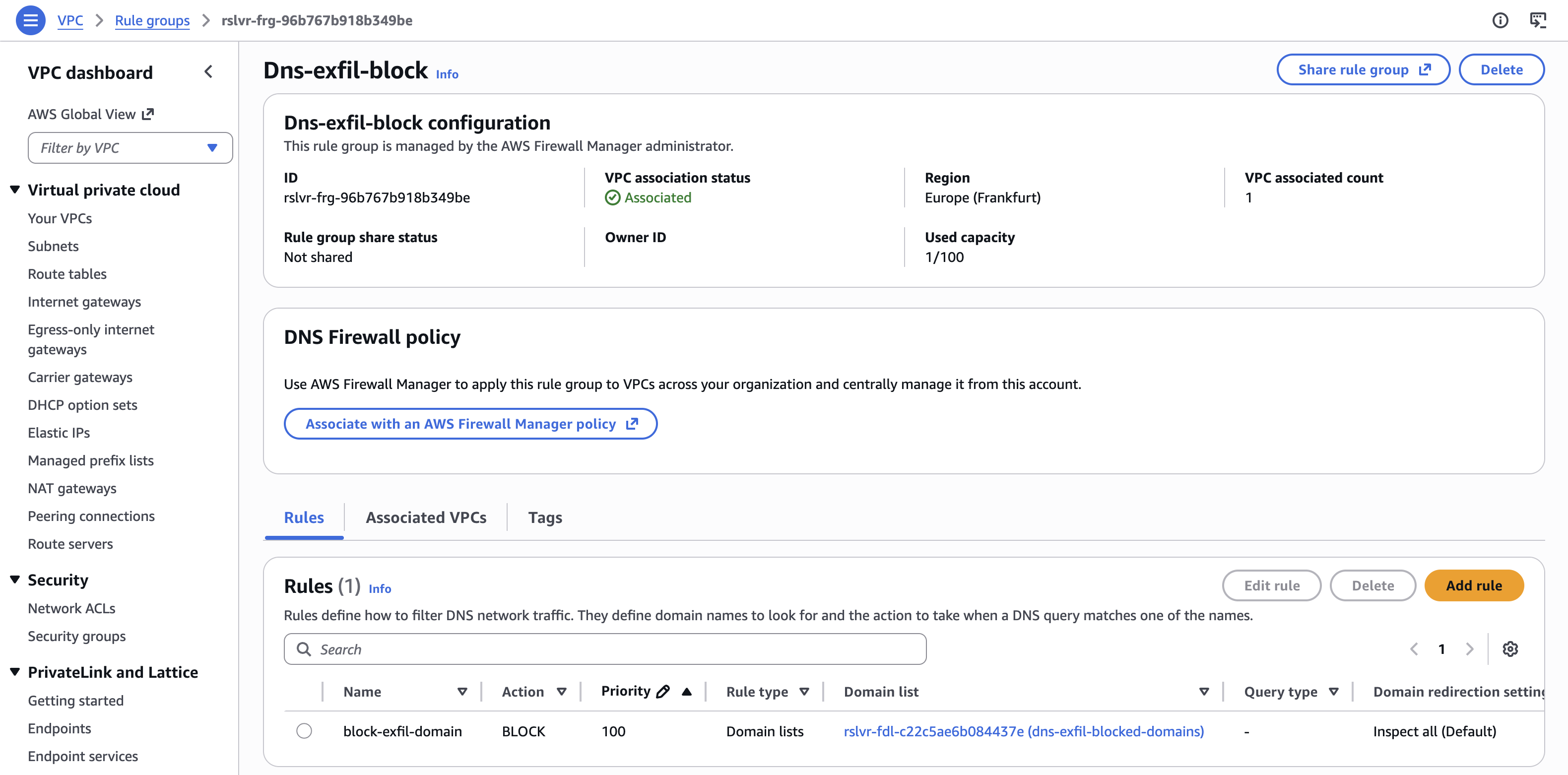 DNS Firewall rule group — Dns-exfil-block, associated, BLOCK rule at priority 100
