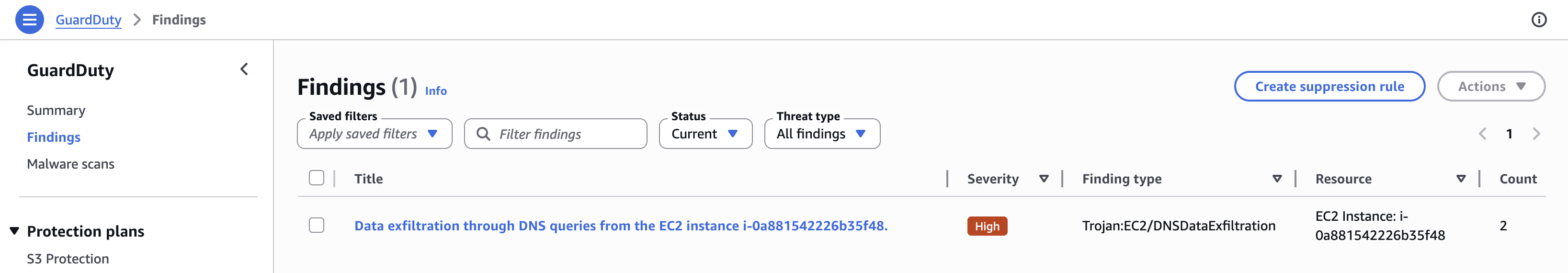 When the same instance exfiltrates to the same domain multiple times, GuardDuty does not create new findings — it updates the existing one. The finding count increments and UpdatedAt advances, but the finding ID stays constant. Alert pipelines that only trigger on new findings will miss repeated exfiltration activity. Trigger on both new findings and finding updates.