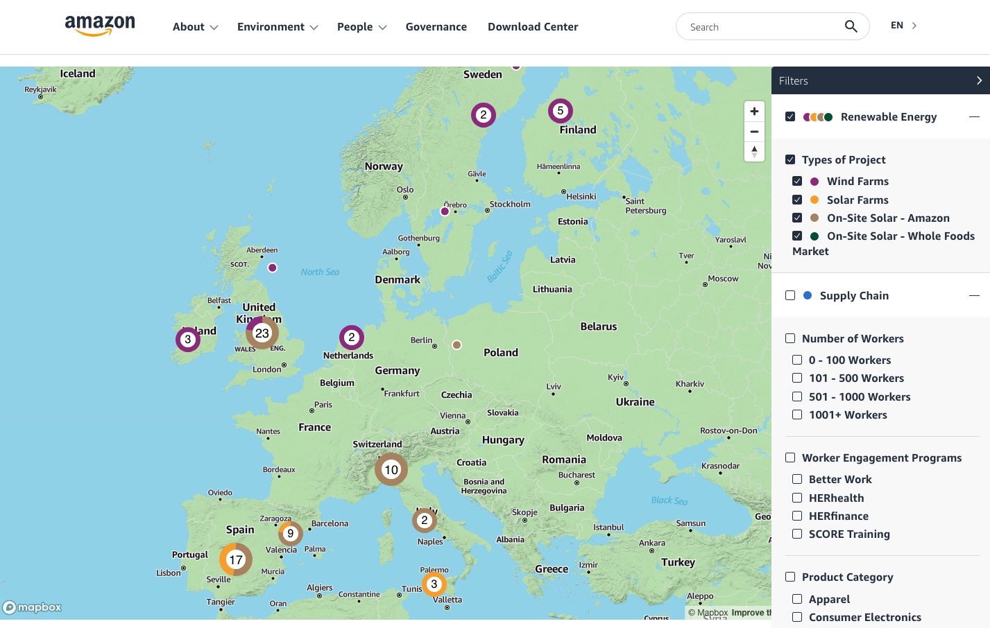 Amazon renewable energy projects map. Image source: https://sustainability.aboutamazon.com/about/around-the-globe?energyType=true